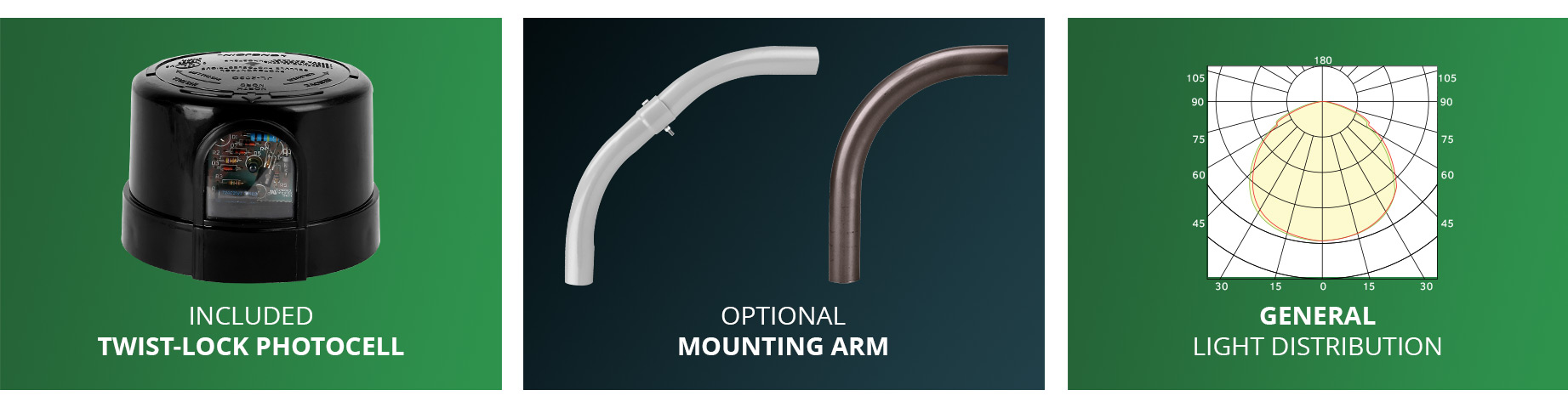 Series GKODDG5 LED Dusk To Dawn Lights feature a pre-installed twist lock photocell that requires no complicated programming or setup, automatically turning the fixture on at 10-20 Lux and off at 60-80 Lux. These versatile LED fixtures are ideal for providing general perimeter or security lighting for a house or other residential or commercial property. This Dusk To Dawn is suitable for surface mounting, or may be mounted on an optional mounting arm to expand the reach of the light. Silver grey and dark bronze color options are available.
